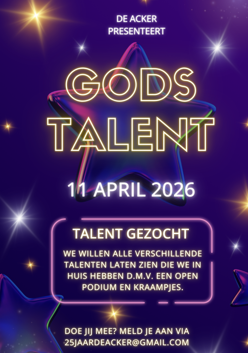 We hebben allemaal verschillende talenten gekregen. Tijdens de jubileumactiviteit van De Acker op zaterdag 11 april willen we graag laten zien wat we in huis hebben. Niet alleen als gemeenteleden van De Acker, ook andere inwoners van Pijnacker Noord zijn van harte welkom om hun talent te laten zien. Dit kan op een podium, maar ook getoond worden in een stand. Wil jij ook je talent, hobby of passie laten zien?